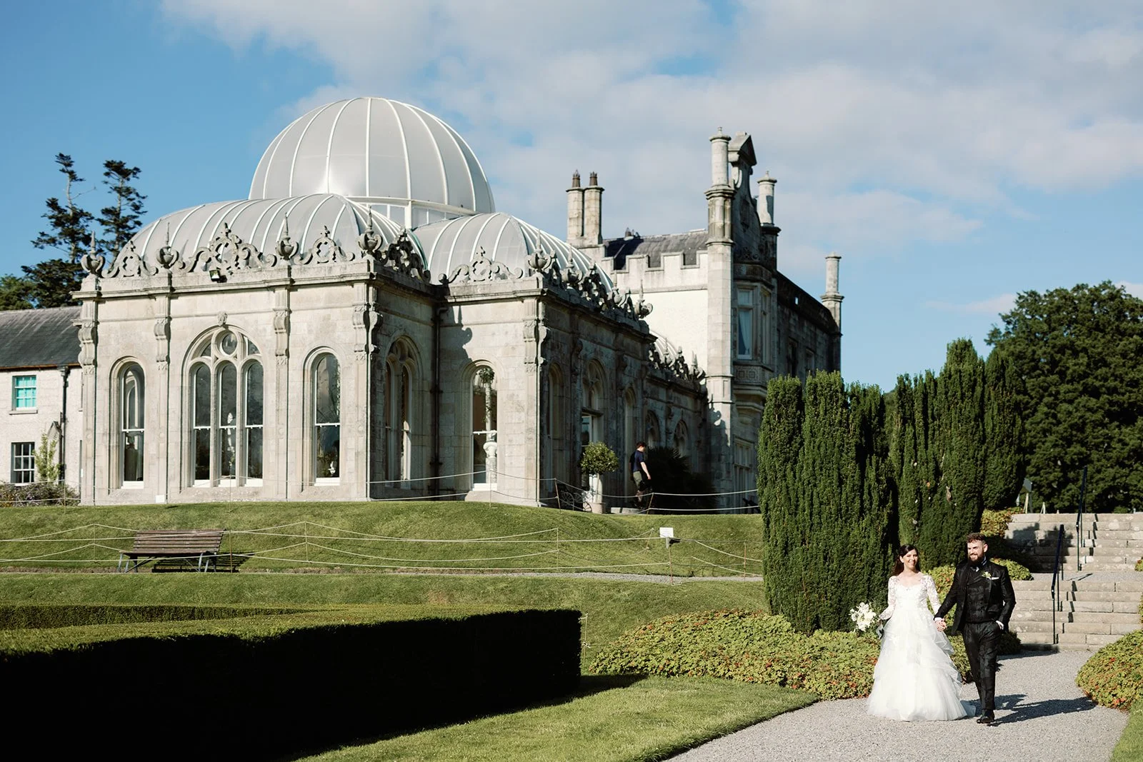 Beyond the vows, the Orangery transforms into a vibrant cocktail setting. Guests mingle under the glass ceiling, laughter echoing amidst the greenery. As the sun dips below the horizon, the venue takes on a new persona. Fairy lights twinkle, casting a warm glow on the faces of your celebrating friends and family. The expansive views outside now shimmer with the lights of nearby Wicklow villages, painting a picture-perfect backdrop for your reception.